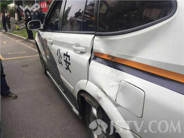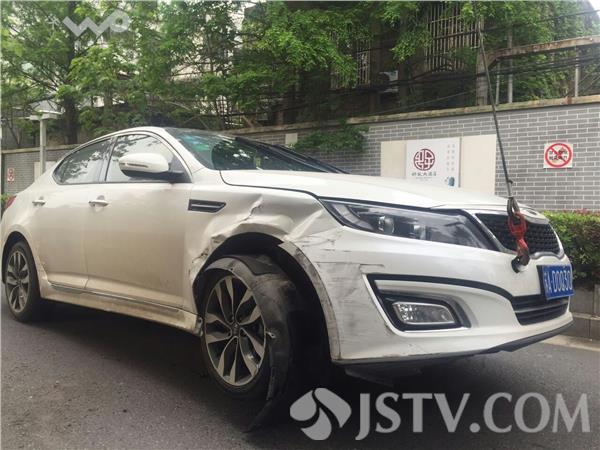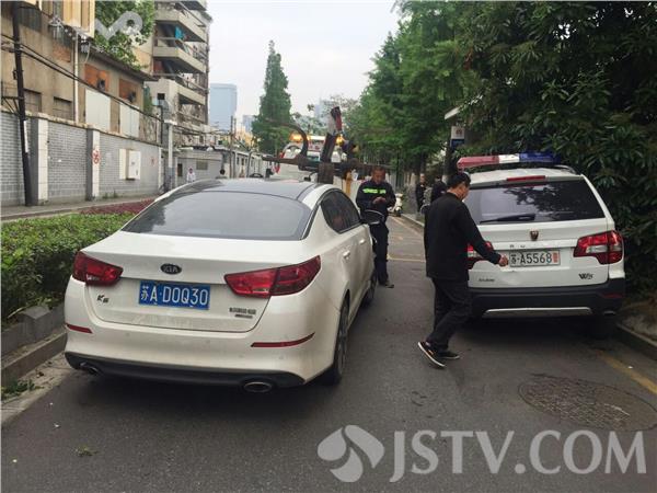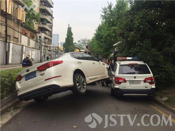 今天(4月24日)清晨7点,在南京玄武区昆仑路由南向北玄武门派出所门口,一辆起亚轿车撞上一辆警车,因为用力过猛轿车骑上警车尾部,警察通知交警前来处理,轿车上一名大约20多岁年轻男子满嘴酒气被交警带走。据了解警车是出警后回派出所,刚刚在停车位停下后面一声巨响,四名警察吓了一跳,巨大的声音对面楼上居民都能听见。大约7:30清障车到场将肇事车辆拖离现场,两车都不同程度受损,目前交警一大队正在调查处理事故。