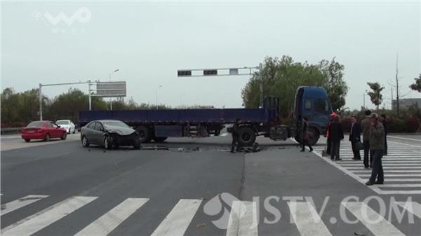 荔枝新闻网友赶到现场时看到,一辆大型半挂货车横停在由东向西的车道上,右前轮轮辋位置留有碰撞时的破碎塑料件。一辆小型轿车斜停在半挂车的东侧车道上,车头已经完全损毁,地面上留有机舱里流出的机油等液体的污迹和破碎的零部件,车内气囊已经打开。