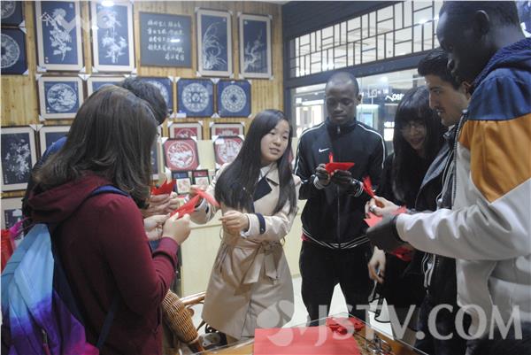 告别了风景秀丽的个园,一行人来到了东关街的“张秀芳工作室”,亲自体验剪纸艺术。同为志愿者的周冉同学是学校里小有名气的“剪纸达人”,灵巧的双手总能创造出充满灵气的作品。在工作室中,周冉教给留学生们剪纸的心得:“有图必有意,有意必吉祥。”来自苏丹的木得自学成才,模仿着剪出了三叶花的形状;来自安哥拉的尤斯也颇有悟性,剪出的菱形落落大方;而心灵手巧的阿里更是得到了周冉同学的夸赞,“有天生的技巧,纸边圆润不毛糙”。