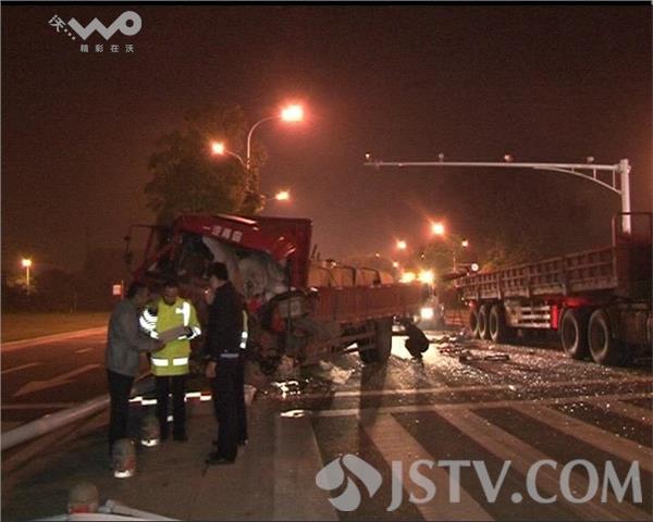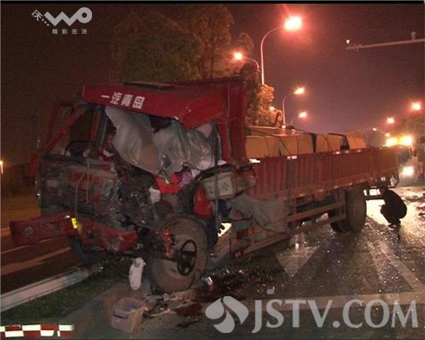 4月28日凌晨两点左右,在南京江宁104国道的一个红绿灯路口,发生一起货车追尾事故,驾驶员受伤严重。据了解,这可能是一起因疲劳驾驶而导致的事故。记者现场看到,两辆大货车停在路口,现场一片狼藉,肇事车严重受损,驾驶室几乎被毁,还留有大量血迹。交警赶到后,及时清理了现场。