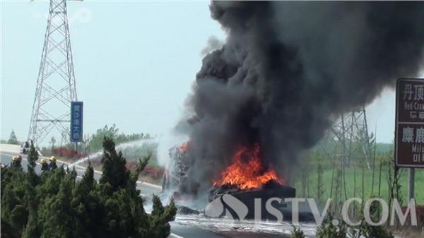 在起火现场看到,射阳县消防大队的官兵们正用水枪压制火势,起火的大型货车停在由北向南的慢车道上,火头数十米高,火势相当猛烈,空气中很重的塑料烧焦的焦糊味刺鼻。