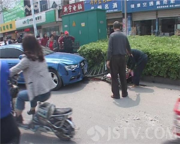 今天(4月29日)下午1点20分,在淮安市涟水县安东路糖烟酒公司门前发生一起车祸,一辆奥迪轿车在机动车道快速行驶时,突然遇到横穿马路的三轮车,轿车失控撞飞路边护栏,又撞上人行道一名骑电动车的女孩.事故造成电动车女孩重伤。