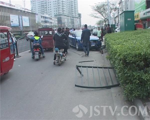 在事故现场,一辆蓝色奥迪轿车车头顶在两块护栏撞在绿化带上,车头已经严重变形。在机动车道里,停放着一辆电动三轮车。据轿车驾驶员讲,事发时,他在马路东侧机动车道自南向北正常行驶,当行驶该路段时,突然发现路东过来一辆收废品的三轮车,于是,他猛打方向,轿车失控,在撞飞两截护栏后又撞上人行道一名骑车上学的女孩,轿车在撞上路牙后停了下来。