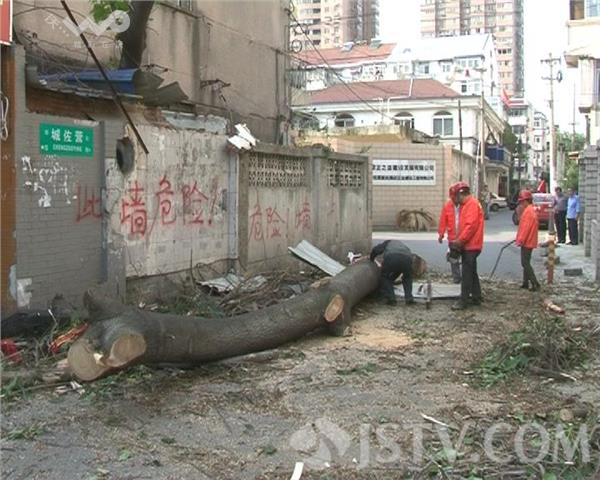 荔枝新闻记者在现场看到,这棵巨大的泡桐树位于一家饭店的院内,树干从墙内伸出,直接砸在了对面的居民楼上,饭店的院墙也有一定程度的损坏。饭店老板说,这棵树是在一个星期前,被大风吹倒的,存在着一定的安全隐患,他们联系园林部门过来清除,园林部门认为这棵树不在自己的责任范围内,所以排除险情需要和社区方面协调。