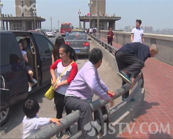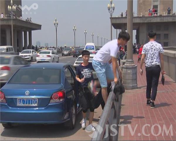 今天(5月1日)中午记者在南京长江大桥南堡附近看见,有很多车辆源源不断地驶入应急车道停靠,有外地车也有本地车辆,甚至还有出租车,他们随意停靠,不顾安全翻过栏杆,在长江大桥上拍照留影。
