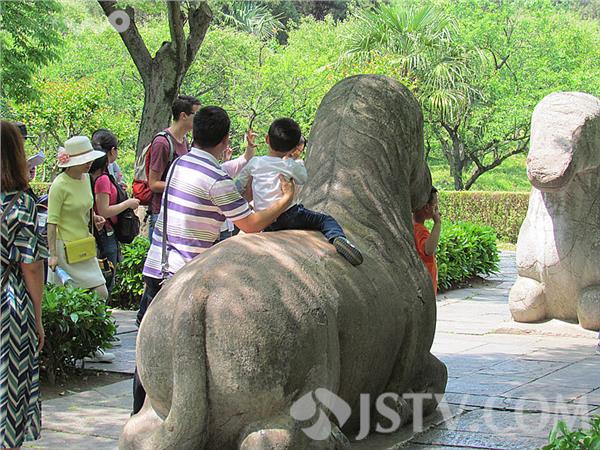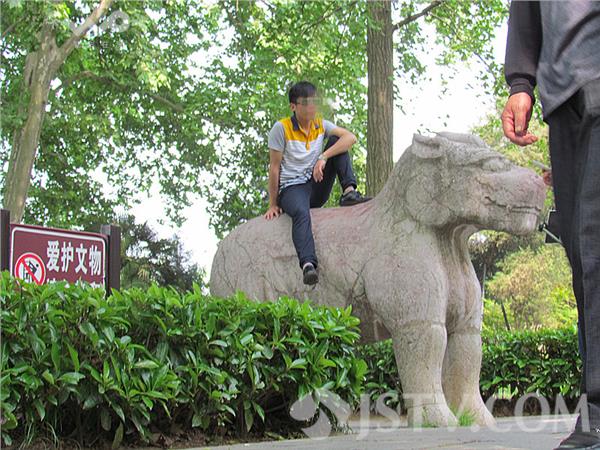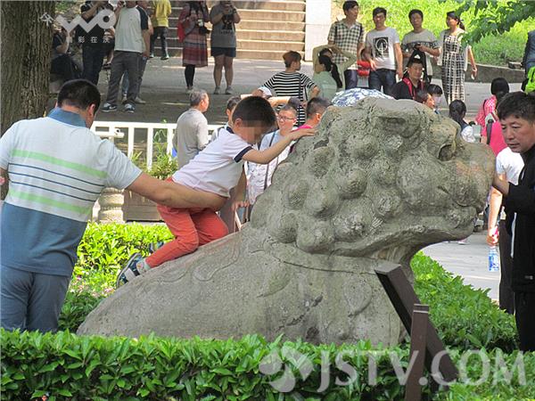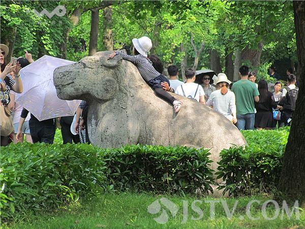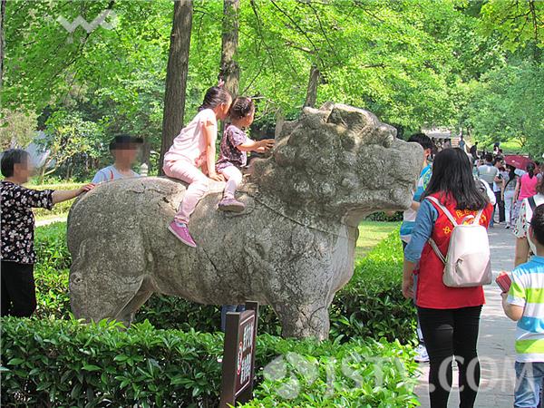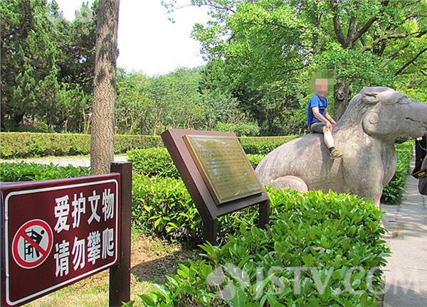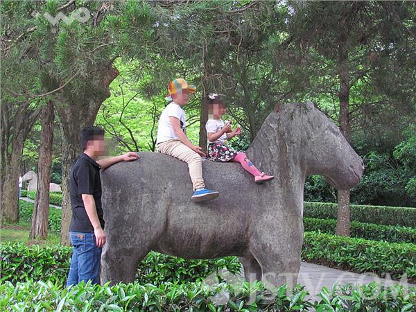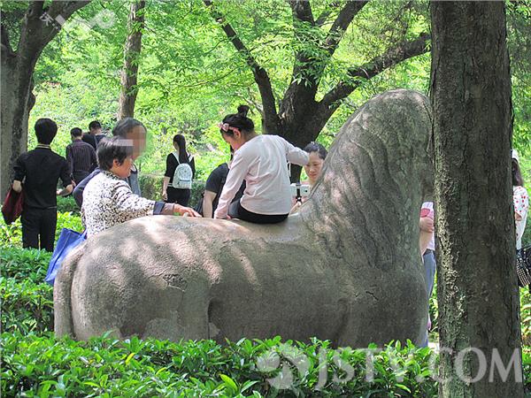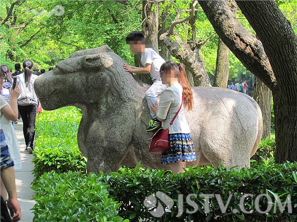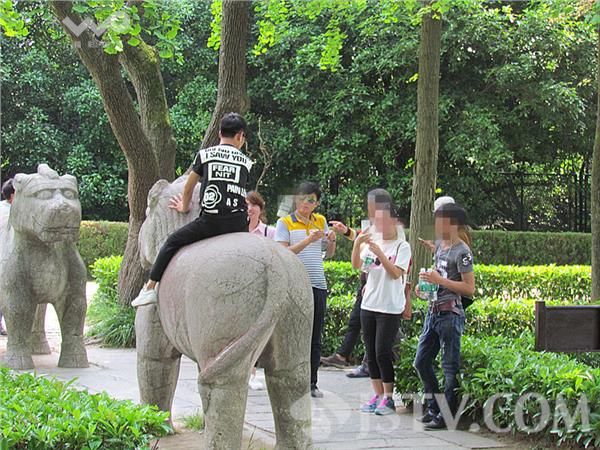 今天是“五一”国际劳动节,又是小长假的第二天,也是国家旅游局依法制订的《游客不文明行为记录管理暂行办法》实施后第二个旅游高峰“大考”。各地景区迎来大批游客,但不少不文明现象仍然存在。下午,笔者来到南京著名的东郊风景区明孝陵,发现景区石象路上,有一些游客随意攀爬文物,成为旅游过程中的不和谐音符。
