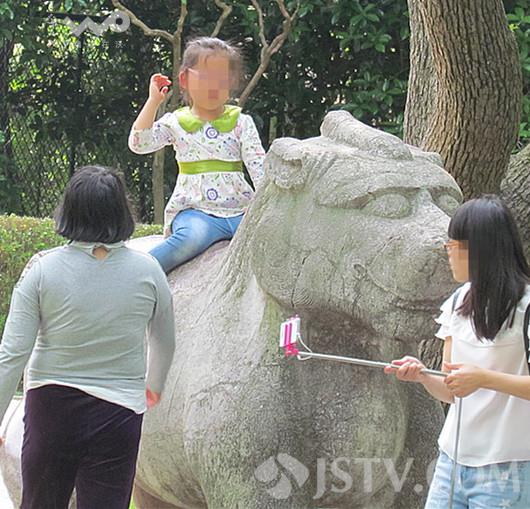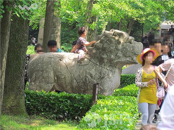 当日下午13:45左右,笔者来到南京中山陵风景区看到,不少游客为拍照,直接攀爬“600多年”文物古迹石象背上玩耍、拍照,对旁边“爱护文物 请勿攀爬”的指示牌置之不理;笔者观察一小时左右,就有十几个大人、小孩爬上祥兽摆拍,有的祥兽上甚至爬上了二三个人! 好多小朋友在爸爸、妈妈、爷爷、奶奶的帮助下,抱上1米多高的600多年文物古迹石象背上。还有两位小老外也加入行列。现场数位大学生志愿者,在石象路不停地来回巡查,发现游客攀爬不停地劝阻他们。劝阻时,有的家长还不听,说:“马上就好”。 有的家长更是不把红马夹志愿者放在眼里,当面就往上爬,我行我素。弘扬文明旅行!希望大家能够爱护文物,共同为良好的旅游环境做出努力。
