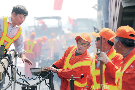 负责现场施工的徐峰介绍,当天早上6:00他们就到工地上了。“中午我们都在工地上吃饭,吃完饭后在路上休息一下,然后继续干。由于现在是试验段沥青摊铺,还不算太忙,下午6:00左右就能下班。”徐峰说:“一旦5月3日、4日起开始大面积沥青摊铺,节假日不休息是肯定的,夜里也要加班,那时候就是歇人不歇机地运转了。”