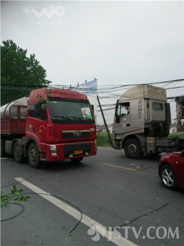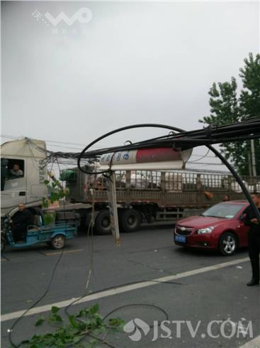 5月2日清晨,泰州兴化229省道荻垛路口,一辆货车因超高将空中的一根光缆刮落,过往的其他货车只能停下,由乘客爬上车顶徒手撑起光缆,缓缓通过。因为今天是五一小长假最后一天,这根电缆给整条道路通行带来了很大压力。目前,民警已经赶往现场疏导交通,并通知相关部门前来处理。