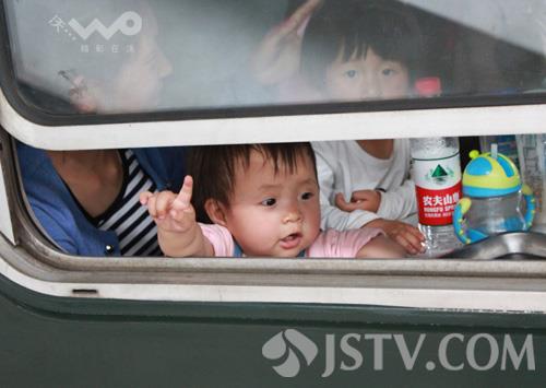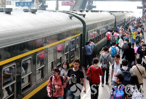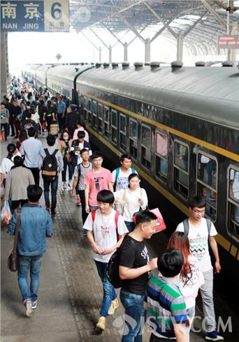 五一小长假期间,众多铁路旅客从南京火车站搭乘增开的K5615次(阜阳—上海)临客列车,在廉价旅行中体验怀旧风。