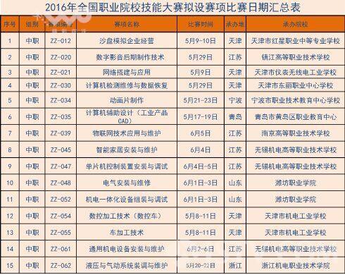 2016年全国职业院校技能大赛将分为中职组和高职组,正式比赛项目涵盖75个大项,94个分赛项,涉及沙盘模拟企业经营、物联网技术应用与维护、工业机器人技术应用、云计算技术与应用、电子商务技能等当下最热门的产业应用。此外,还包括模特表演、烹饪、艺术插花、酒店服务、园林景观设计等好看又好玩的比赛项目。