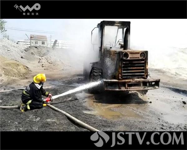 在火灾事故现场,赶来的消防队员发现,此时大火在大风的助力下,正处于处于猛烈燃烧状态,整个车身已经被大火包围,发动机旁的柴油箱还不时往外漏油。根据现场情况,消防队员急忙利用泡沫水枪对火势进行堵截,并对油箱进行降温防止发生爆燃。经过近十分钟的处置,火势基本被控制,但是起火的挖掘机烧毁严重。