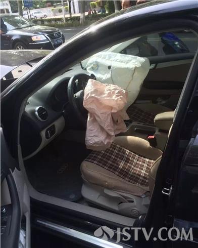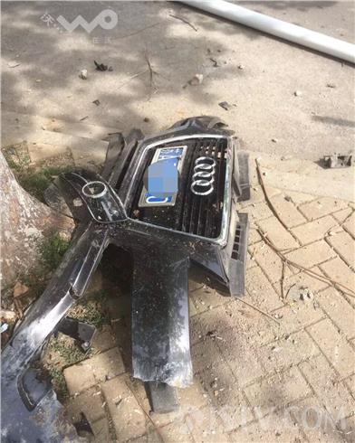 据在场市民讲;白色汽车在自己的左侧行驶,为了避让前面的一辆工程车,突然向右侧猛打方向盘,与奥迪车相擦碰,奥迪车车子一下蹿上了路基,又将路灯杆撞倒,接着又撞到路边的一颗大树,随后车子180度飞转,掉头停在马路中间。幸运的是车子的两个气囊全部打开,不然,后果非不堪设想。