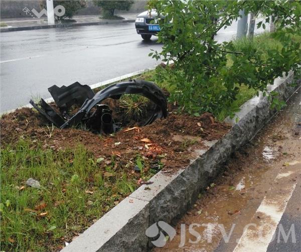 据附近居民说,他当时正在家里面做事,突然听到外面轰的一声,跑出来一看,一辆小轿车爬到路中间隔离带碗口粗的香樟树上面,汽车配件洒落一地。事故发生后,警方第一时间赶到现场把撞倒树木移动到安全地方,目前事故具体原因警方正在调查。