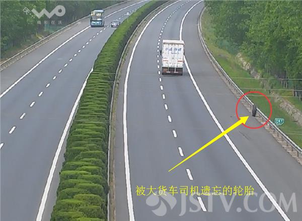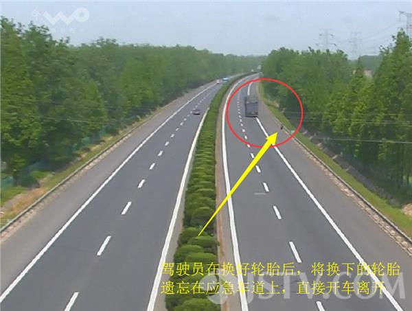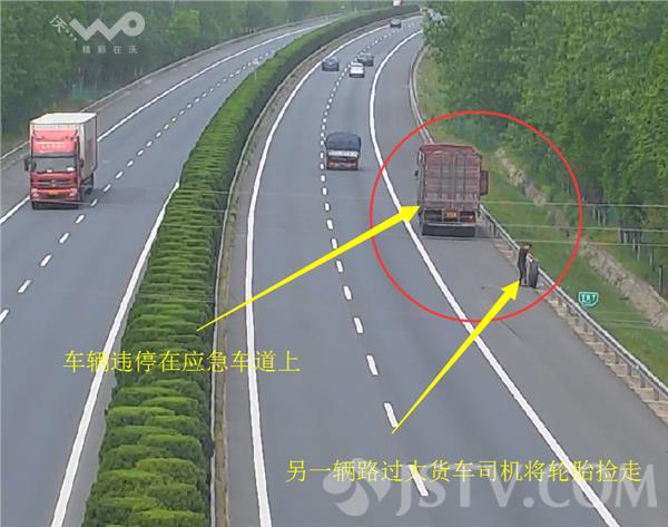 监控上显示,之后一辆红色大货车在经过时,突然在应急车道停下,从副驾驶位置下来一名男子,一路小跑到轮子跟前,麻利地将轮子滚到车前面,捣鼓一会之后,费力地把轮胎放到车上扬长而去。