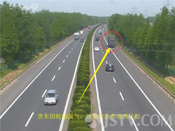 通过回放监控显示,当时有一辆蓝色大货车行驶途中突然在K729公里应急车道上停了下来,接着从车上下来两个人,在货车后面摆放三脚架后开始在车前面捣鼓起来。大约五分钟后两人上了车,货车驶离时拉下了一个轮胎。