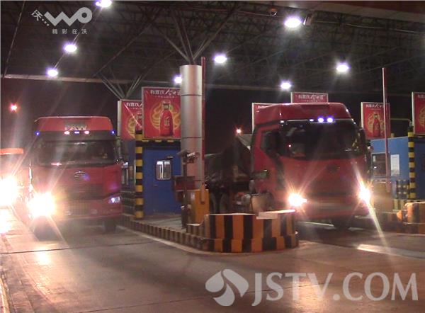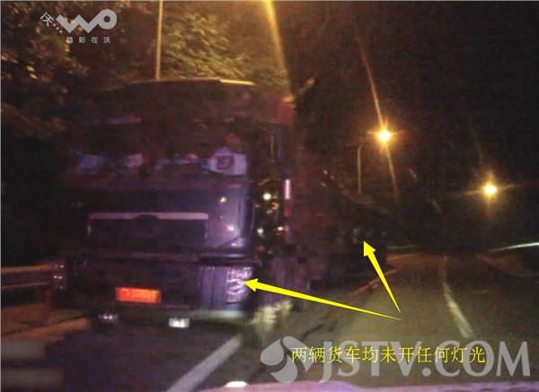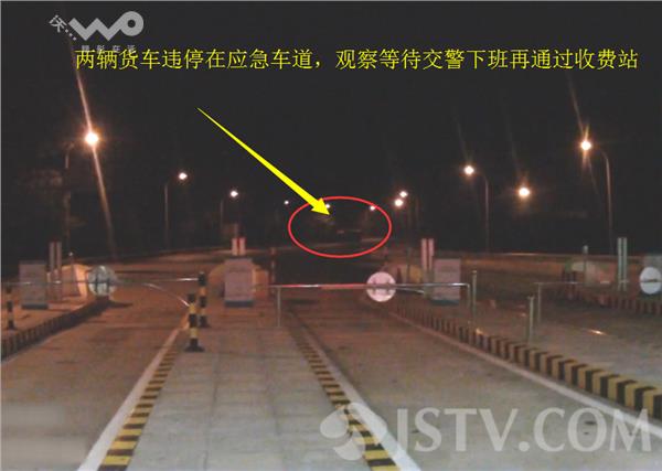 在新沂东收费站,民警远远看到两辆货车停在匝道位置,没有打开任何灯光,非常危险,民警立即驾车过去查看。