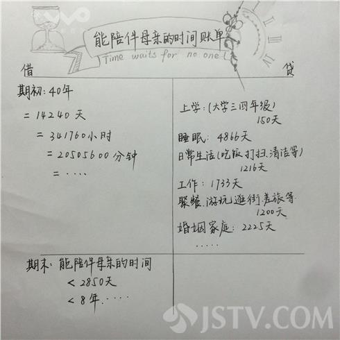 “假设我们还能陪母亲40年,这40年里,要减去上学、上班、为生活忙碌的时间,日后成家立业为婚姻和家庭付出的时间等。”周琳娅指着手中的账单,最后得出的结果是2850天,也就是这40年里,即使把所有能空下来的时间陪伴母亲,也只有八年的时光。况且,没有人知道生活会不会像计划那样安排的刚刚好,更何况也只是列出了一些大项。