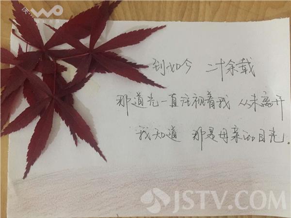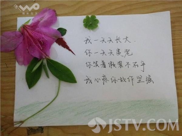 初夏时节,扬大校园里雏菊盛开,罗佳同学利用学校里的花花草草制作了卡片,并附上小诗,表达对母亲的爱与感恩。罗佳同学说,“平日里我羞于表达对母亲的爱意,希望借此机会说出藏在心底的感激。” 她还在卡片上题了一首小诗,诗中这样写到:“我一天天长大你一天天变老你笑着假装不在乎我心疼你故作坚强。”