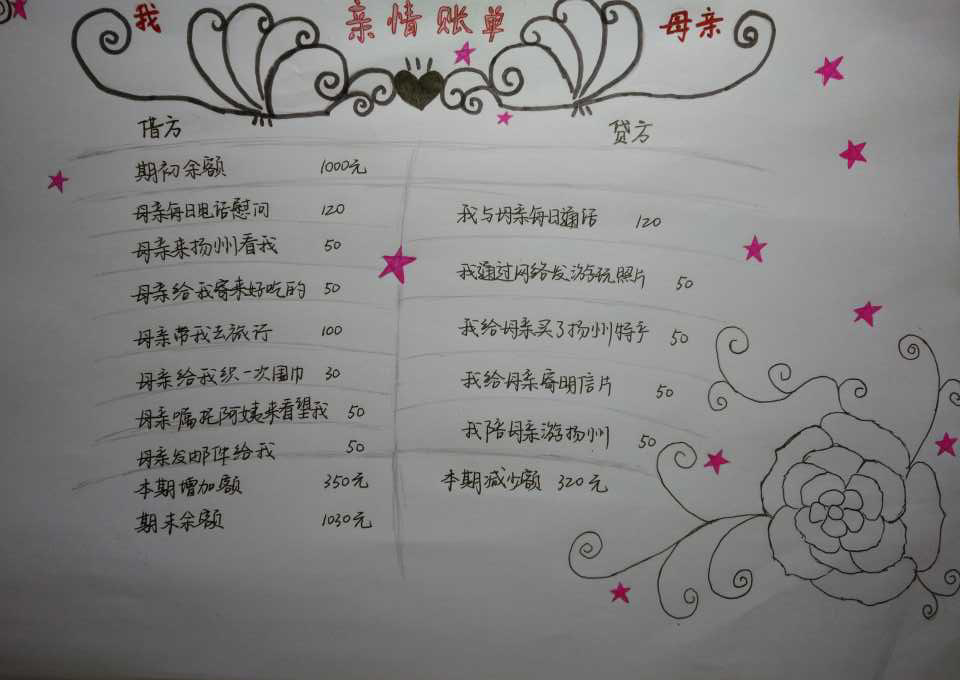 商学院财政班的李前韩同学利用所学专业知识制作了一张记录与母亲亲情往来的账单,利用会计分录的方式,详细清算了上学期母亲的付出与自己的回报。李同学将自己假定为借方,将母亲假设为贷方,并将期初余额设定为1000,她把每次母亲对她的关爱记作借方,而把自己对母亲的回报记作贷方,最终计算出期末余额为1030。