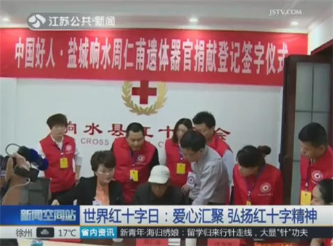世界红十字日来临之际,在盐城响水,92岁的中国好人、抗战老兵周仁甫在家人的陪同下来到县红十字会,在器官和遗体捐献同意书上郑重地签下了自己的名字,献礼“世界红十字日”。周仁甫说,当时一起参加工作的人都牺牲了,现在就是剩下他一个人了。将来捐献自己的遗体,最后一次为人民服务,心里也就坦然了。