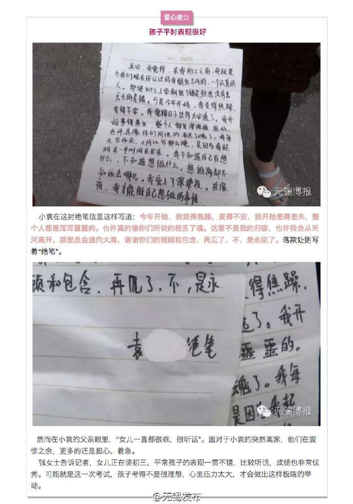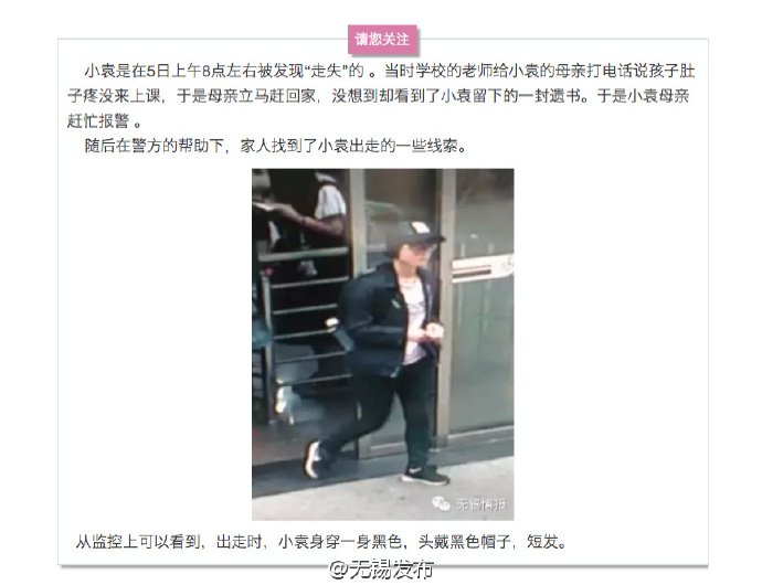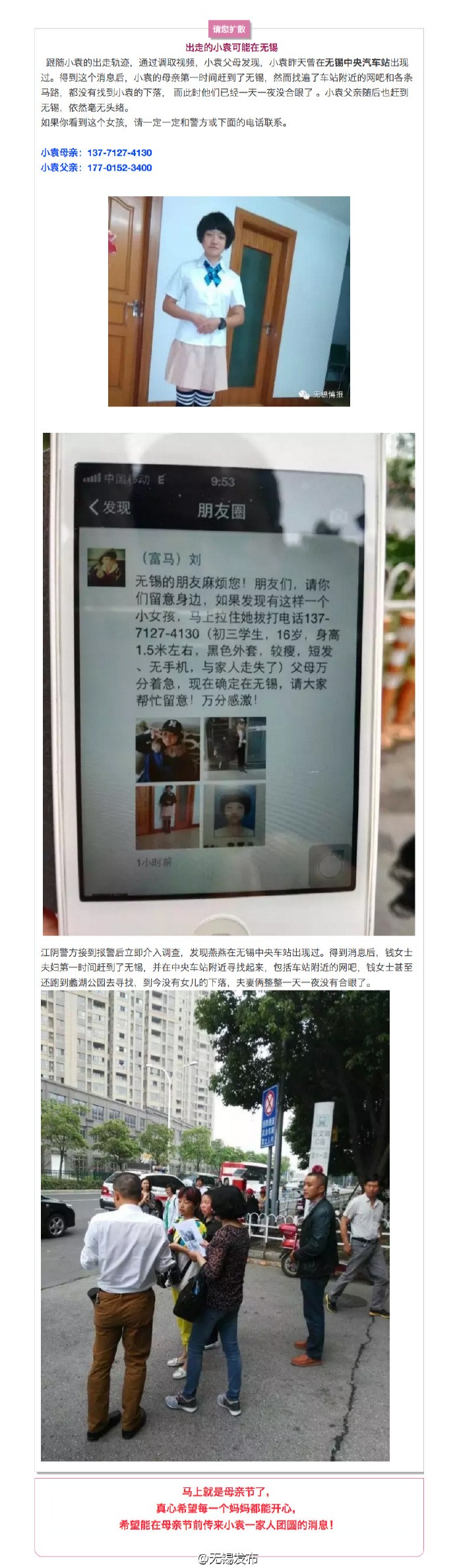 【 紧急寻人!江阴一名初三女孩留下遗书出走】 据@无锡博报 ,5月5日早7点,江阴云亭初三女生小袁留下遗书后从家里出走,疑因学业压力太大。小袁身高1.5米左右,短发,较瘦,出走时穿黑色外套。5日中午11点多,小袁曾在无锡汽车客运站出现。知情者请联系警方或燕燕父母:13771274130!