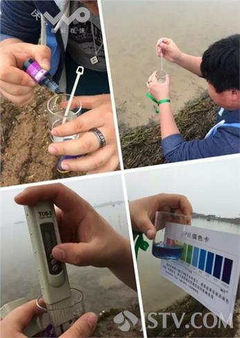 在骆马湖公园的门口,环保志愿者们系上了象征环保的绿丝带,分成五组分别在骆马湖周边做志愿活动。志愿者在采样点用仪器采集水样,并用PH试纸检验水样的酸碱性;环绕骆马湖河岸和走道清理垃圾;还有一群志愿者针对骆马湖的采沙问题、生态问题对周边居民和游客开展问卷调查。