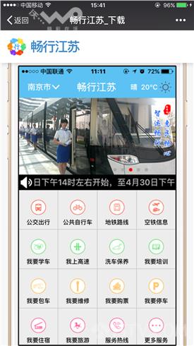 打开“畅行江苏”可以看到,公交出行、公共自行车、地铁路线、空铁信息、我要学车、我上高速、洗车保养、我要培训、我要包车、我要维修、我要购票、我要停车、我要住宿、我要旅游、服务热线等十多个功能集齐。“畅行江苏”微信公众号也同步上线,提供公交、地铁、高速查询等交通出行的公众服务。