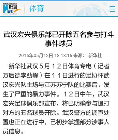 今天(5月12日),武汉宏兴足球俱乐部宣布,将明确参与追打苏宁球员的22号柴雷、11号陈浩等5名球员开除,目前俱乐部正配合足协进行调查,依据相关视频确定其他违规违纪球员。北京时间5月11日下午,2016年中国足协杯第三轮继续进行,业余球队武汉宏兴将在主场0-1不敌足协杯卫冕冠军江苏苏宁。最后时刻两队发生冲突,两队发生群殴,苏宁球员谢鹏飞疑似遭到群殴。武汉公安局江汉分局一路一行5名民警今天上午赶赴南京的江苏苏宁俱乐部,进一步调查该队球员遭受伤害的具体信息,以便根据伤情确定事件性质;另一路民警通过调看相关视频资料,确定了部分在看台上涉嫌参与违法行为的人员,并着手对其身份进行核实调查,将进行进一步处理。