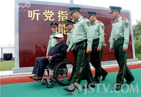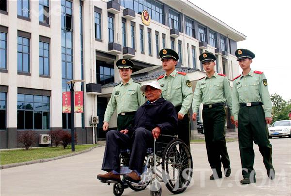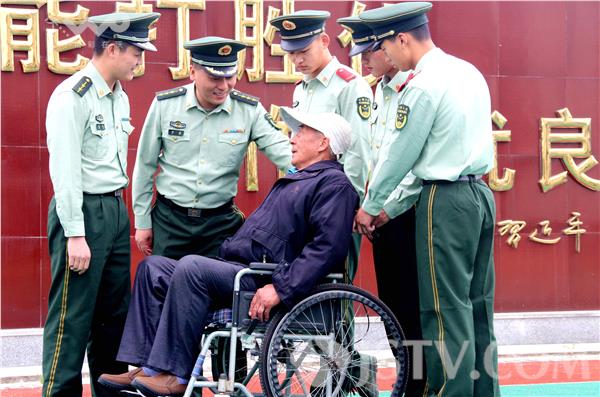 2016年5月13日,武警扬州公安边防检查站仪征二中队官兵,将驻地长江村84岁的抗美援朝伤残老兵钱恩华接到营区,参观营区建设,开展传统教育,激励青年官兵。