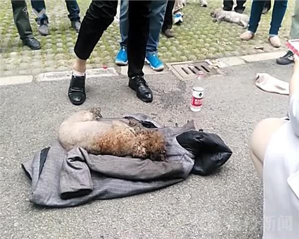 不过在52幢居民楼前,只见二三十名居民所围着的,是两条宠物犬,犬的面部、四肢以及腹部等处被烟熏黑,其中一条已经死亡,另一条躺在一件男式外套上,仍在眨眼,嘴巴也在动,一名女子蹲在旁边,心疼地一手不停抚摸爱犬的头部,一边用手机查询信息。旁边,一名男子用瓶装水漱了下口,也拿起手机翻了几下,紧跟着两人用外套将这条宠物犬包起来,快步冲出小区赶往宠物医院。