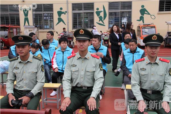 一位女孩在诗朗诵后,说了一句感谢解放军叔叔,引起了现场人群的关注,随着小朋友的眼神,大家看到观众席上正襟危坐的几名武警战士,他们正是来自盐城边防检查站监护中队的同志,他们为了能够准时参加此次活动,在排长的带领下,起早就从海边来到市区,并且为本次活动带来的舞蹈节目,与特校学生共度助残节。