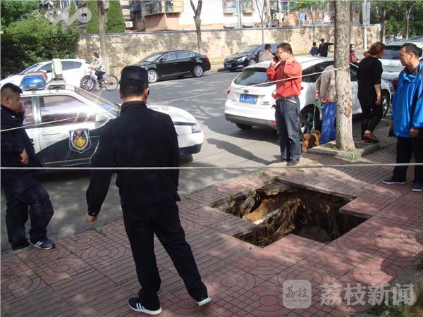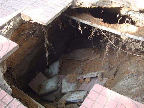 今日(5月18日)早晨7点半左右,南京鼓楼区铁路北街人行道路上,一行人刚开过,就听见身后“轰”的一声,人行道路上突然塌陷出一个二米多宽,深约3米的大洞,地洞5米宽,而且还有扩大趋势。考虑到过往行人的安全,警察和市政部门已经在洞周围摆放警示标志。