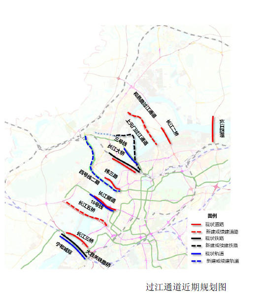 新建长江五桥、和燕路道路过江通道,新建 4 号线二期轨道过江通道,新建上元门铁路过江通道。