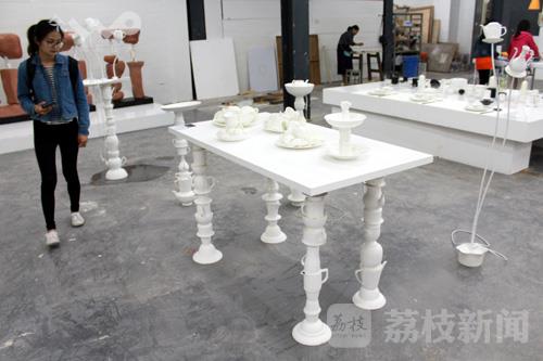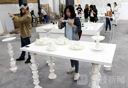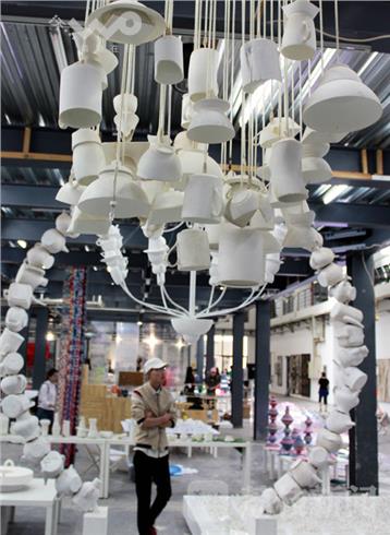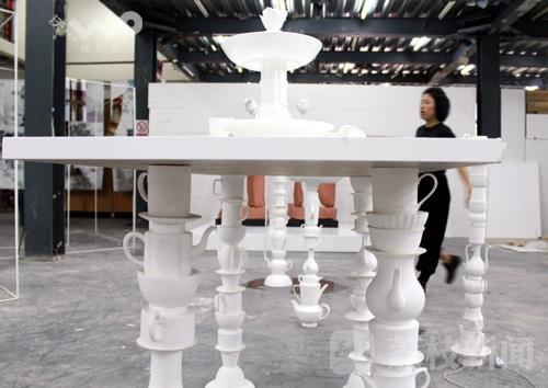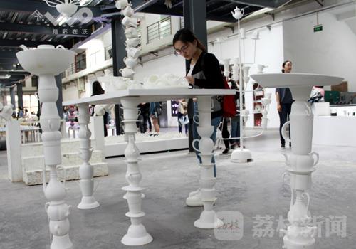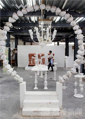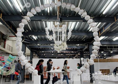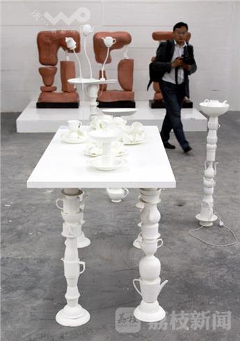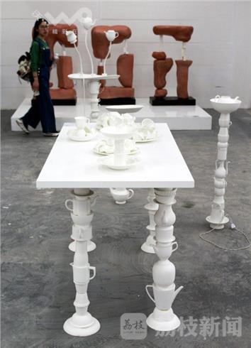 5月20日,在南京艺术学院毕业展演“嘉年华”现场,一组“陶瓷餐厅”艺术作品新奇亮相,吸引了众多参观者。这组“陶瓷餐厅”作品名为《重塑回忆》,由拱门、吊饰和餐桌组成,均采用陶瓷器皿和配套部件构造。其中,拱门由陶壶拼接而成,餐桌桌腿由陶壶等陶瓷器皿作为支撑,既富有文化创意,又具有观赏性。