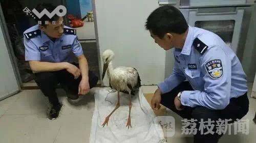 据介绍,当时有群众向盐都区公安局新区派出所报警,称在冈中区杨韦村三中桥下,发现一只疑似小鹤的动物,这只小动物浑身湿漉漉的,一直想飞起来,却怎么也飞不动,村民们担心这只小动物有生命危险,便报警求助。接到报警后,派出所民警随即赶到现场,将小动物装进一个大纸箱中带回派出所。后来,民警打电话向盐城国家级珍禽保护区寻求帮助,保护区工作人员赶到后确认,这是一只出生只有两个月大的东方白鹳,属国家一级保护动物。保护区工作人员介绍,正常情况下,东方白鹳要长到三个月以后翅膀硬了才能独自飞翔。