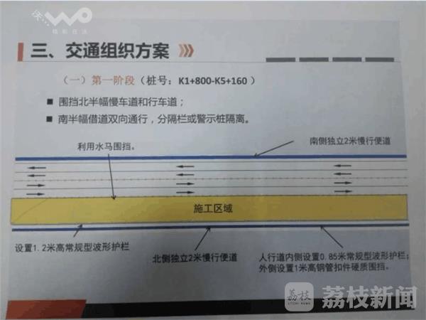 对此,警方提出交通疏导方案,312国道上的七乡河大道路口至绕城公路栖霞互通东侧路段,路面为双向6车道,目前进行第一阶段施工:围挡道路中分带及两侧各一股车道,进行中分带拆除工作,预计用时1个月。车辆需从道路中心围挡外两侧的双向4车道通行。疏港大道上的龙潭港一期大门东侧至七乡河大道路段,路面为双向6车道,目前进行第一阶段施工,预计用时5个月。疏港大道港际路至港城路路段:由东向西方向围挡北半幅行车道和超车道,围挡外侧的一股车道和借用南半幅超车,确保由东向西方向两车道通行;由西向东方向按照道路外侧两股行车道通行,道路用分隔带和警示桩隔离,确保双向4车道通行。在南侧、北侧道路以外新建2米宽的便道,方便行人、非机动车通行。