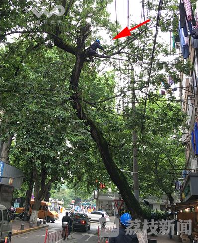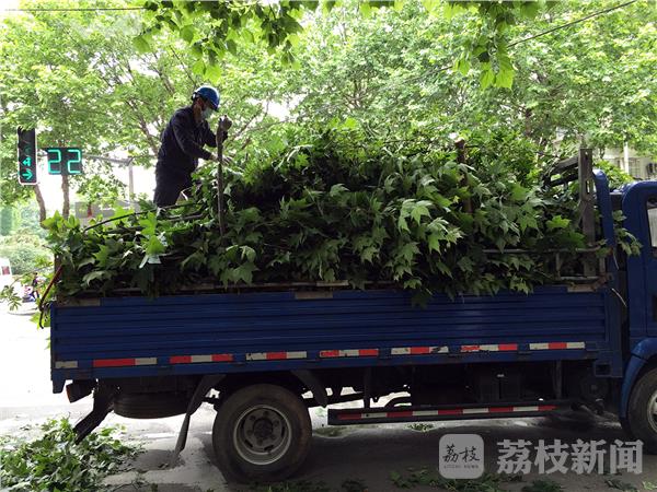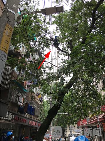 一位刚从树上刚下来,浑身冒汗的工人讲,扬州路上有11根电缆线,其中顶上的3根是万伏电压的高压线,低下8根是低压线,“虽然线外都有绝缘材料包裹,但是如果长时间被树枝磨蹭,电线的皮一旦磨破,雨天树枝碰上电线就会导电,对行人构成威胁”。他说,白天扬州路周围单位和居民众多,停电会影响工作,“我们不能停电,只能带电作业”,这几天雨水特别多,树上全是青苔,脚一踩就打滑,高压线周围全是新长出来的树枝,要耐心清理,不能马虎。