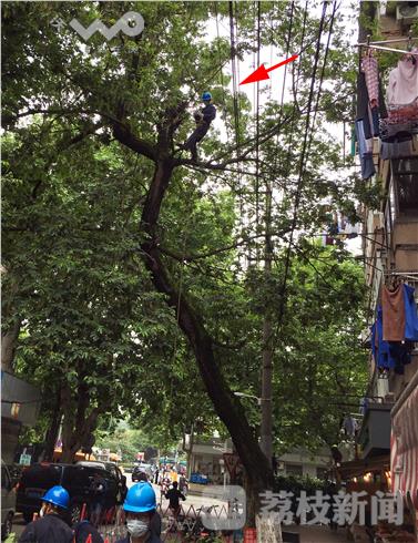 荔枝新闻网友在现场看到几位工人爬上树顶,有的拿锯子锯,有的拿带镰刀的长竹杆钩,把一根根影响电线安全树枝弄下来,他们虽然系有安全带,但是摇摇晃晃危险重重。