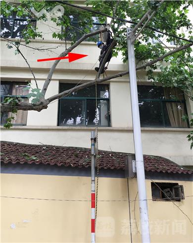 2016年5月23日上午11时许,南京市供电局数十位工作在一线的电力工人,为了清量缠绕在鼓楼区扬州路高压线上的树枝,爬上20多米高满是青苔的大树,看得围观行人心惊肉跳。