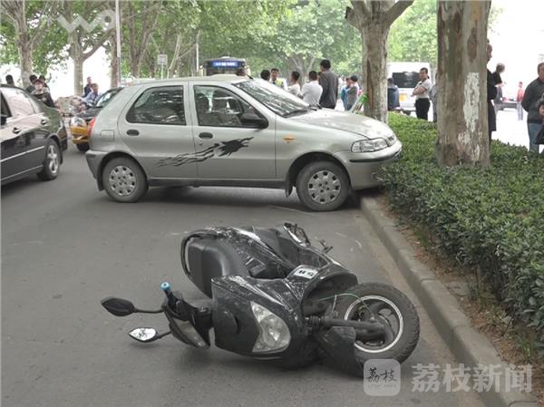 记者在现场看到,一辆银灰色轿车车头骑在路中间的绿化带上,旁边一辆摩托车倒在不远处,摩托车旁边还有少许的漏油,而轿车的车头明显瘪了一块。一位身穿黑T恤的小伙告诉民警,这车是他开的。