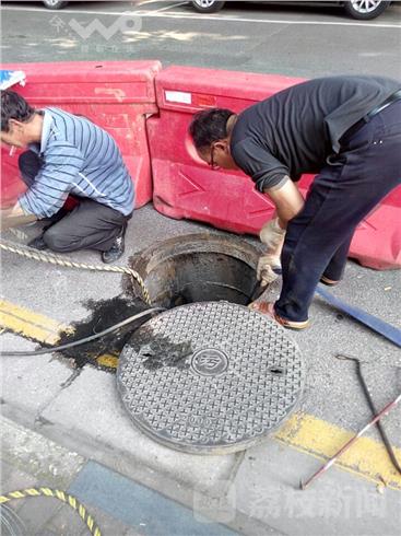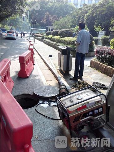 当日下午3:00左右,笔者途经南京玄武区汉府街时,突然发现道路北侧, 7、8个红色隔离墩挡在路边,有十几米长,抽水泵不停地往市政雨水井偷排污水。现场发现,污水井盖敞开着,井口放着一台发电机,一台抽水泵一头放入污水井底,一根蓝色橡皮管西沿十几米远市政雨水井,水管压在排水沟井下,污水源源不断地偷抽入市政雨水井。整条皮管差不多有15米长,直径25厘米左右。被南京玄武市政工作人员发现,及时制止违法排污行为。