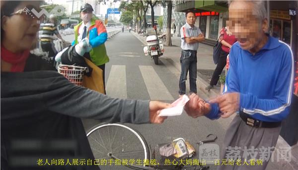 事发后,这位中学生显然被这一突发情况给吓坏了,声音里明显带着哭声。正在此时,一名骑电动车的大妈出现了。大妈看到之后,当场拿出100块钱,让老年人去医院看病,让孩子赶紧去上学。