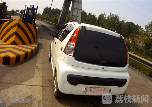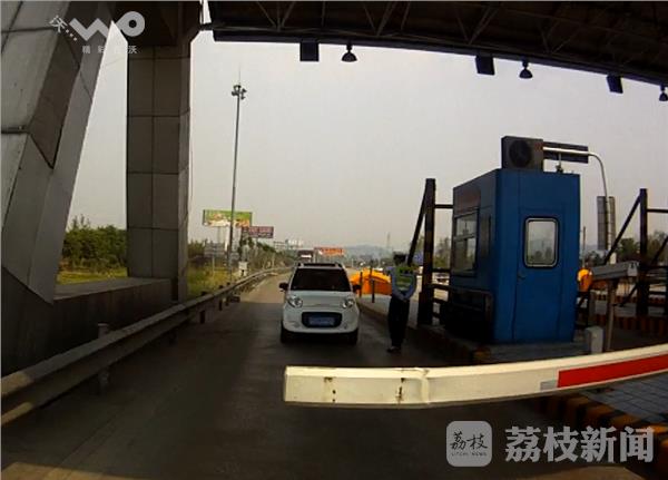 这辆车准备从ETC通道上高速,不料阻车杆并没有抬起,于是该车倒回试图从人工通道通过。民警发现该车没有安装牌照,车牌位置写了'观光车'三个字和一些数字编码,于是立即上前进行检查。
