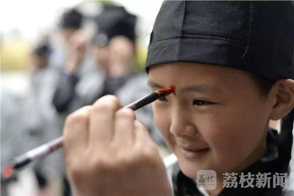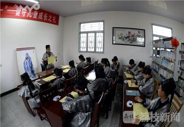 在举行“成长之礼”的现场,15名留守儿童依次洗净手、正衣冠、点朱沙、拜圣人、写人字、看家风展览,并一起宣读“成长宣言”、诵读《弟子规》。书社负责人,即“成长之礼”活动主办人乐华泽介绍说,活动进行过程严肃认真,让孩子们从中感受传统文化魅力,接受文明礼仪教育。通过写“人”字,让孩子们认识到要堂堂正正做人、干干净净做人。