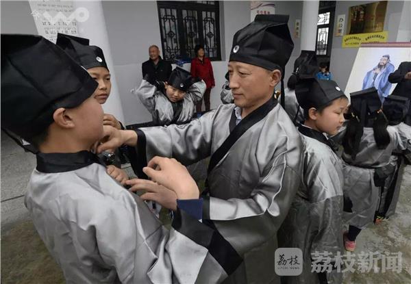 5月28日下午,在盐城市盐都区尚庄镇华泽书社里,15名留守儿童身着汉服行“成长之礼”,喜迎“六一”儿童节的到来。