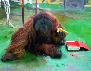 说起乐申,南京市民应该对它应该不陌生。乐申是华东地区第一只人工育幼长大的红猩猩,1999年5月27日出生在红山动物园,是动物园里的大明星。乐申从一出生就话题不断,人工育幼、征名、《非诚勿扰》 征婚、结婚、分手、被挖墙脚……“红猩猩如果身体健康的话,寿命一般在40岁左右,今年乐申17岁,大概相当于人类35岁的样子。”猩猩馆的饲养员窦海静告诉记者,在乐申生日的这一天,动物园的工作人员用鸡蛋和面粉特别制作了乐申适合吃的蛋糕。