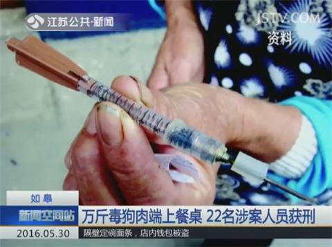 检方披露,2014年,如皋居民张老伯发现宠物狗走失。警方经过排查,一个“毒狗、加工狗肉”的违法链条浮出水面。其中一位嫌疑人甘某长期收购狗肉。警方发现,仅2个月的时间,他就收买了1.4万余斤有毒狗肉。在抽取的狗肉样本中,警方发现了氰化物。随后,警方又成功将制售剧毒氰化物的马某、于某等人抓获,彻底捣毁了这条有毒食品犯罪链条。