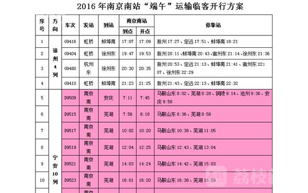 南京南站计划增开客车20.5对,最大亮点是增开宁安方向始发动车8列,过路高铁2列,加上图定开行的18趟高铁动车,端午节日期间宁安线开行高铁动车数将达到28列,实现了宁安方向高铁动车公交化开行,极大方便南京和皖南两个地区市民短途游出行。另外增开始发至杭州东G9477、G9479次2列;始发至虹桥G9405、G9407、G9413、G9417次4列;始发至合肥D5443、 D5495次2列。(开行车次、到开时间见附表,具体列车开行日期以12306官网为准)。