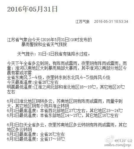 江苏气象今天上午10点53分也发布了暴雨警报: